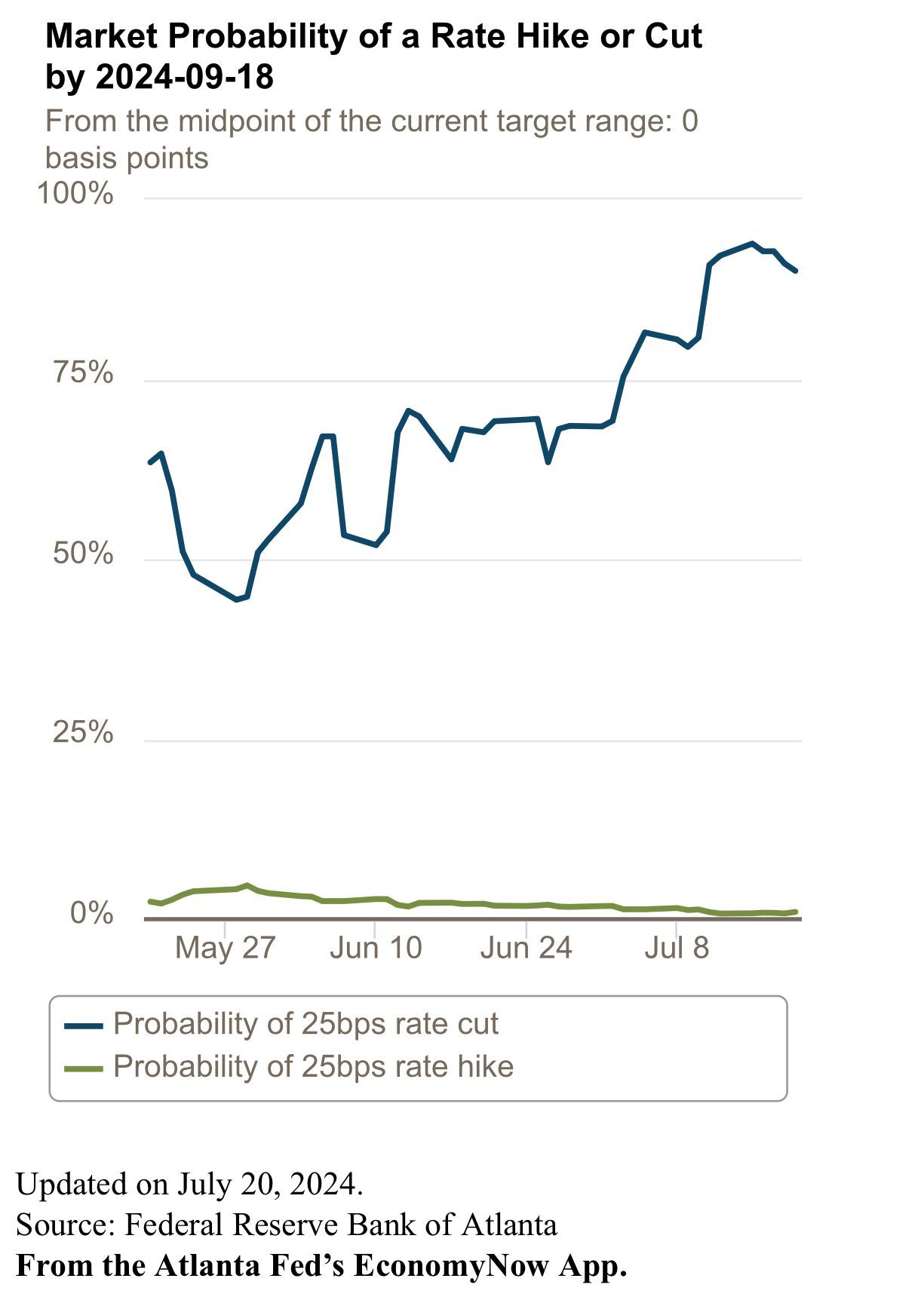 The second graph, from the Federal Reserve Bank of Atlanta, points to a high probability that the Federal Open Market Committee (FOMC) will cut interest rates by September 18, further improving conditions.